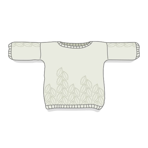 Fiche technique envoyée par mail en PDF à télécharger, en français, permettant de tricoter Pierre, pull tricoté en mohair, jersey endroit avec des motifs de feuilles en dentelle en bas du corps et le long des manches. Explications détaillées, schéma pour les dimensions et la réalisation du pull, diagrammes pour les motifs feuilles.